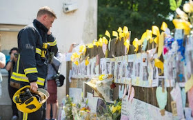 Firefighter reviewing Grenfell Tower Fire victim tributes